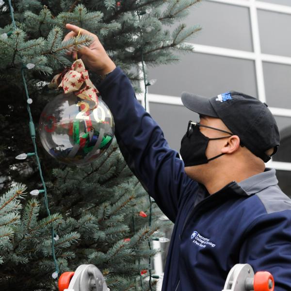 Each December, the College's military family decorates the Veterans Holiday Tree outside of the Madigan Library. Andrew and his crew take pride in this annual tradition that pays respect to service personnel near and far.