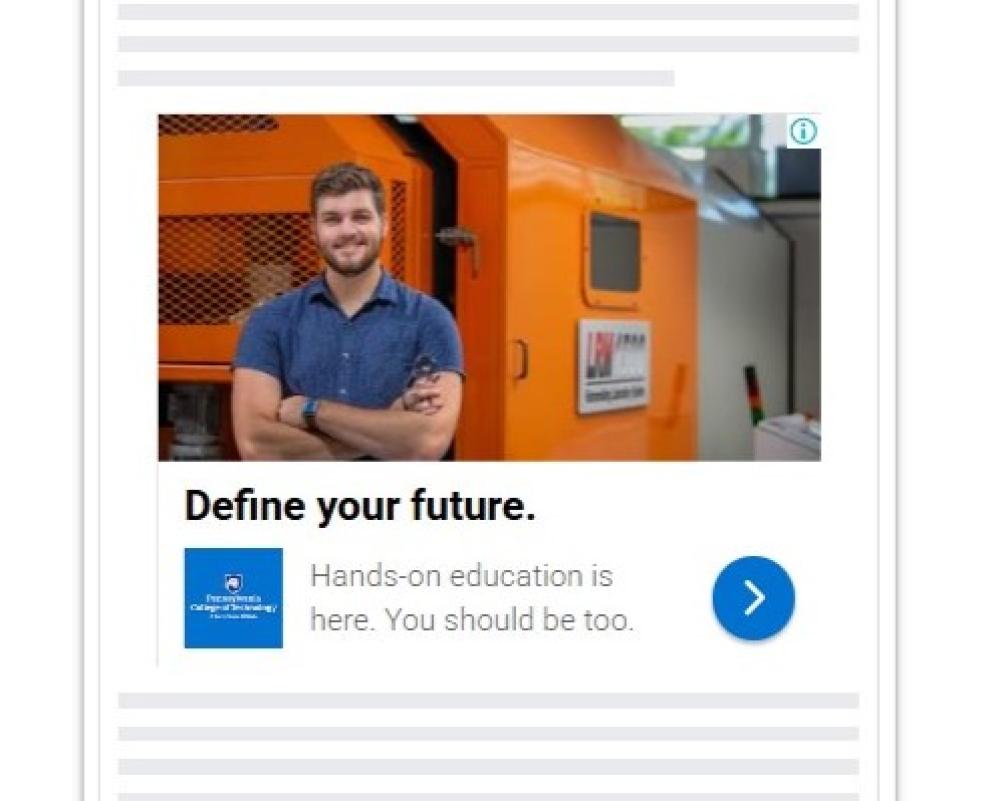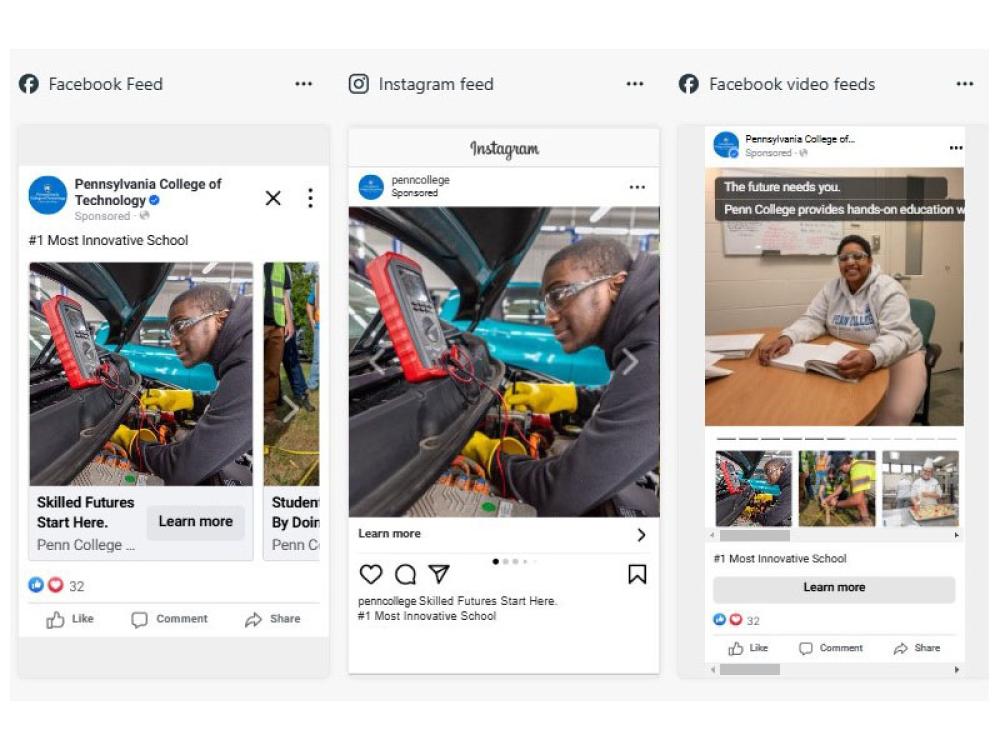 Our thousands of variations of Google, Meta, and LinkedIn ads—covering all prospects and influencers with interest-aligned copy and visuals from across the entire academic catalog—are created to introduce the many ways that Penn College stands apart. Here is a sample of top-performing brand ads.