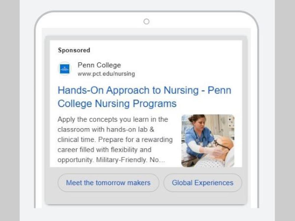 Our 2,000+ variations of Google search ads—covering all prospects and influencers—are ready to help our target audiences research the college or take the next step. Google's responsive search ads display different combinations of headlines to show the ad that will perform best. Sometimes this includes a photo and sometimes it does not. Here is a sample of our top-performing search results ads.