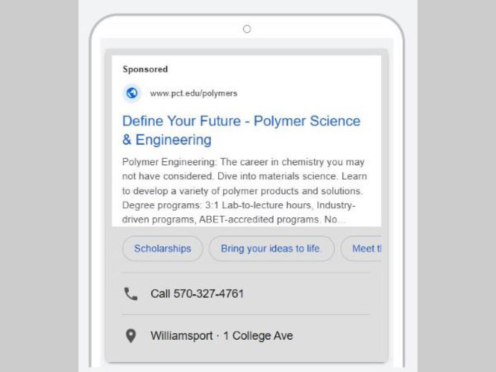 Our 2,000+ variations of Google search ads—covering all prospects and influencers—are ready to help our target audiences research the college or take the next step. Here is a sample of our top-performing Materials Science Engineering & Technology ads.