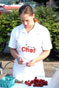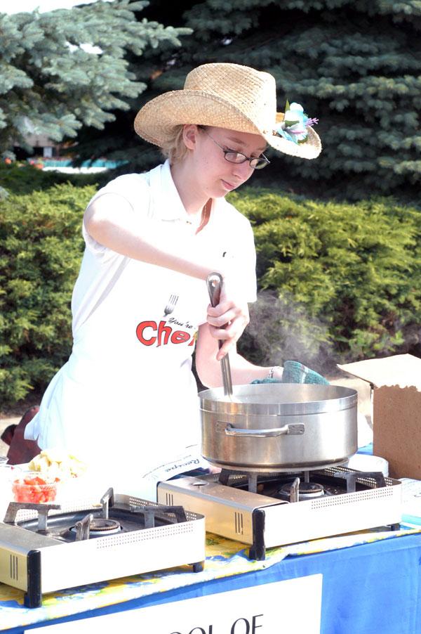 School of Hospitality students and "You're the Chef" production coordinators Jennifer R. McHenry of Lock Haven (far left) and Christine L. Faherty of Wantage, N.J., joined Chef Paul E. Mach at the Williamsport Outdoor Grower's Market on Saturday for a cooking demonstration. Gathering their raw materials from the regional merchants on hand − ingredients ranging from elk sausage and strawberries to honey and swiss chard − the trio prepared a variety of dishes for the crowd's obvious enjoyment.