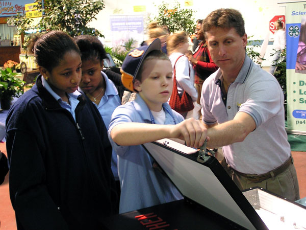 Kirk M. Cantor, professor of plastics technology, helps youngsters operate the vacuum thermoform machine Lawrence J. Fryda, dean of industrial and engineering technologies, clowns around with a visitor from the Zembo Shrine Electronics instructor Bruce M. Smith shows off a robot that handed out school lanyards to Farm Show visitors T. Jay Cunningham, assistant professor of civil engineering technology (and an alumnus), greets Farm Show attendeesPenn College's School of Industrial and Engineering Technologies put its stamp on a weeklong series of Pennsylvania Farm Show appearances, providing the public with a popular, hands-on look at the college's "degrees that work." Jeff B. Weaver, assistant professor of electronics and this year's "Master Teacher Award" recipient, provided these photos of the school's attention-getting display. Youngsters were lined up 15-deep to use the vacuum thermoform machine, part of the college's mobile poly lab, and a robot was programmed to distribute blue-and-white lanyards to visitors. More detailed information about the college's activities at theannual event are available online.
