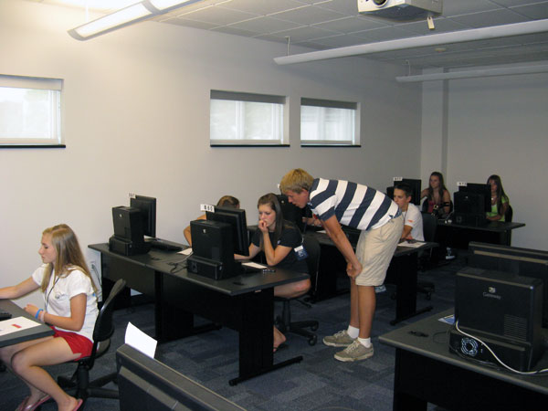 Playing cards in library classroom Computer access popular with teenage visitors Enjoying the spacious library atrium Pennsylvania Free Enterprise Week students were offered secure wireless Internet access and a tour of the Madigan Library on Friday, the final day of their stay on campus. Students especially took advantage of the library's 30 laptops (all were checked out), spreading throughout the James Everett Logue Popular Reading Atrium. Others formed groups in the first-floor classroom, where they played card games and checked Facebook/MySpace. One student, in particular, enthusiastic about art, checked out the latest exhibit in The Gallery, "Japan Juxtaposed." ( Photos and information provided by Keith M. Saboski, Madigan Library circulation supervisor)