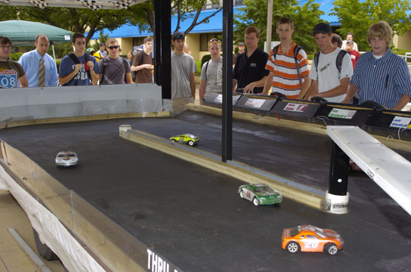Student racers in spirited competition outside the Susquehanna Room With Food Services preparing a free hot-dog lunch nearby, a stream of students competed in Microreality Racing on the LEC Patio on Tuesday. Just one of the many Student Activities events planned for this first week of the fall semester, the attraction allowed racers tomanuever radio-controlled replicas of race cars around a trailer-mounted oval track.