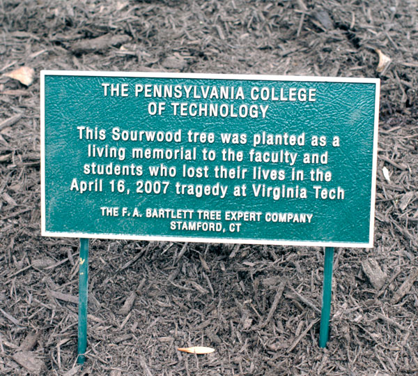 An international leader in residential and commercial tree care this week planted a sourwood at the Schneebeli Earth Science Center in honor of the April 16, 2007, shootings at Virginia Tech. Like VT, Penn College is among 28 institutions that participates in the Bartlett Tree Foundation, the educational scholarship arm of the Stamford, Conn.-based F.A. Bartlett Tree Expert Co. Each of those colleges and universities is receiving a tree from Bartlett, which delivered Penn College's living memorial in conjunction with this week's Career Fair and advisory committee meetings in the School of Natural Resources Management. Pictured on either side of the tree, from left, are Dennis Fink and Dennis P. Skinner, assistant professors of horticulture; Carl J. Bower Jr., instructor of horticulture; Brad Evans, a 1989 forestry alumnus of Penn College and representative of Bartlett's York office; Mike Taylor, from the company's Chambersburg office; and Mary A. Sullivan. school dean. "This treeis a tribute tothe students and faculty killed in the tragedy at Virginia Tech," said Taylor, who delivered and planted thedistinctive sourwoodMonday morning. "Hopefully, it will live on for many years in their memory."