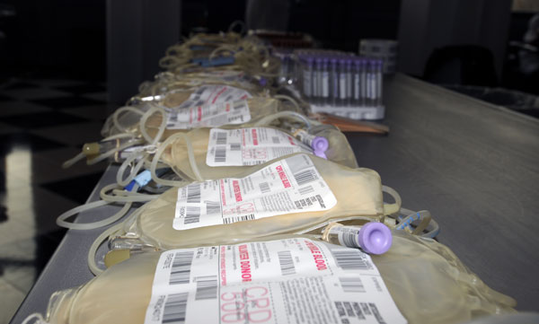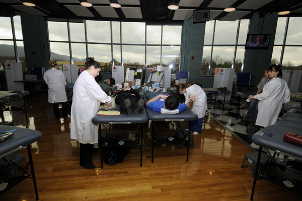 Unfilled bags await always-needed blood donors Students, employees heed the Red Cross call for donationsNearly 150 pints of blood were collected at the Jan. 20 Red Cross Bloodmobile in Penn's Inn short of expectations, but, as every pint goes toward saving another life, a worthy effort nonetheless. Student and faculty/staff donors contributed 147 pints (135 whole-blood donations and 12 pints through the double-red-cell process) in the daylong visit. The next campus Bloodmobile will be April 28. Photos by Michael S. Fischer, student photographer