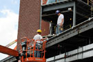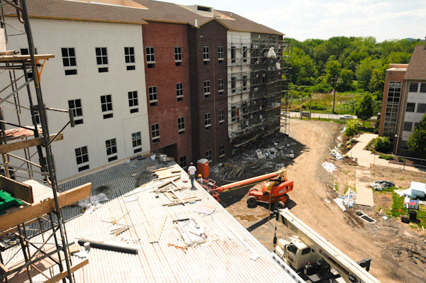 As construction crews keep pace for this fall's occupancy of Dauphin Hall, Penn College's newest student-housing complex, Andrew M. Richardson, construction manager, provided this summary of on-site work: Curtain-wall and room-window installations continue, as does the Exterior Insulation Finishing System (with the final color being applied and the split-face masonry nearly complete). Masons are finishing the trash enclosures and soon will begin the brick for the new guardhouse and entry-gate piers. Painting of interior block is ongoing, and work continues on soffits and coffered ceilings in common areas and corridors. Ceilings have been started on a few floors and carpet installation is about to begin. The final areas of thermoplastic polyolefin roofing are under completion, curbing and parking-lot islands are proceeding, and concrete pads and walks are in the works. Mechanical, electrical and plumbing contractors are busy with "rough-in" and prep work for finishes. The complex is part of the college's Stage X building program, which also includes renovations to the Hager Lifelong Education Center, Parkes Automotive Technology Center and Avco-Lycoming Metal Trades Center/Machining Technologies.