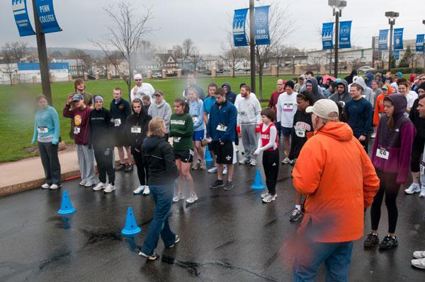 Emily B. Miller, instructor of fitness and lifetime sports, talks with runners at the starting line Runners braved the wind and rain to participate in the second School of Health Sciences Endowed Scholarship 5K Walk/Run on April 16. The 5K is organized by faculty and staff in the School of Health Sciences, the college's largest school, to build the fund, which will be permanently endowed when it reaches $25,000. Interest income from the fund will be used to award scholarships to students in the School of Health Sciences.