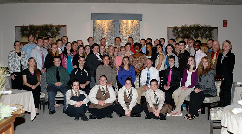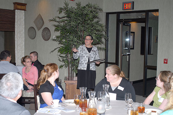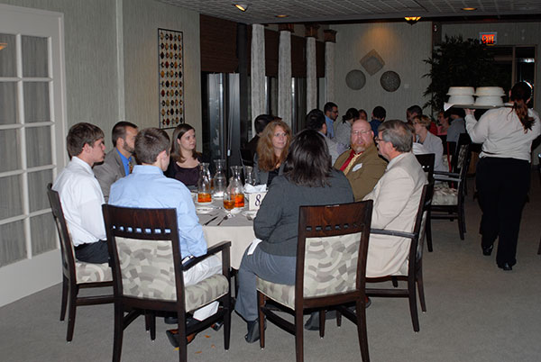 Tuesday night's Etiquette Dinner gave dozens of Penn College students the opportunity to learn the ins and outs of fine dining to prepare for a job interview or other professional event in which social graces could be a make-or-break consideration. The banquet drew about 50 students and nine mentors to Le Jeune Chef Restaurant for a School of Hospitality primer in which fork to use, why not to text during dinner, the enduring necessity of "please" and "thank you," and what to do with that pesky napkin when temporarily leaving the table. The soup-to-coffee crash course, which has grown into a semi-annual event in barely two years, is co-sponsored by Career Services and Alumni Relations.