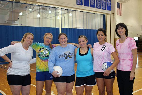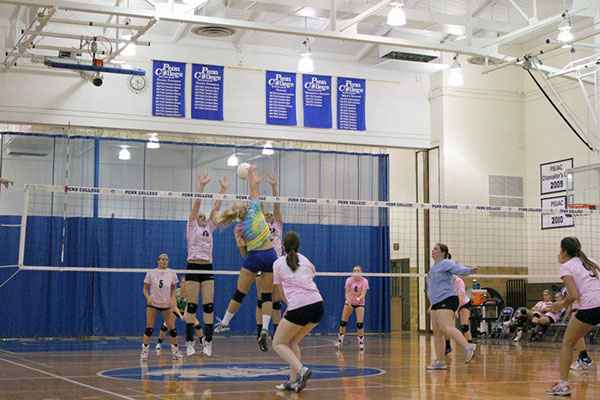 Alumni members of the Wildcat volleyball team returned to campus Saturday afternoon to challenge the current Penn College women's squad, playing well enough to win a set. "The current team was experimenting with their lineup a bit," said coach Bambi A. Hawkins, who refereed, "and had to return to their familiar lineup to finish out the match against an alumni group that was quite feisty and not about to give up." Alumna Rachel A. Zick bowed out after the first set to attend to her 6-month-old daughter, so current player Rachel E. Heller filled in – playing "front row (middle blocker/hitter) well despite her usual role of defensive specialist," Hawkins noted.Photos by Becky J. Shaner, alumni relations assistant
