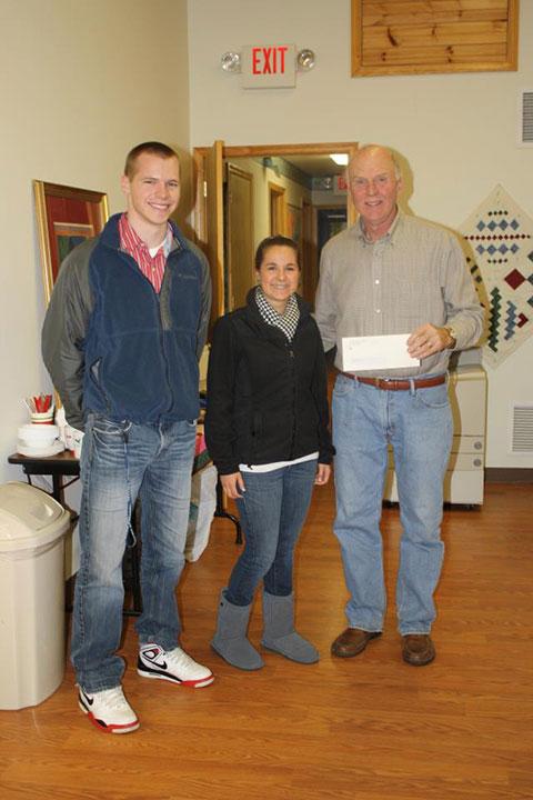 This year's Student Government Association representatives on the Penn College Homecoming Court recently presented a $1,777 check to Camp Victory at Millville, a 120-acre haven for children with lifelong medical needs. Homecoming King Tyler J. Durham, an information technology: information assurance and security concentration major from Newville, and Ashley J. Maietta, a nursing major from Hughesville, delivered the donation to camp founder Dennis Wolff. Homecoming candidates collected a total of $3,554 through canisters at the Bush Campus Center information desk; Camp Victory received half of the money as Durham and Maietta's selected beneficiary. (Homecoming Queen Michelle C. Markardt, an early childhood education student from Hawley, recently made a similar presentation to her charity of choice.)Photo provided by the Student Activities Office