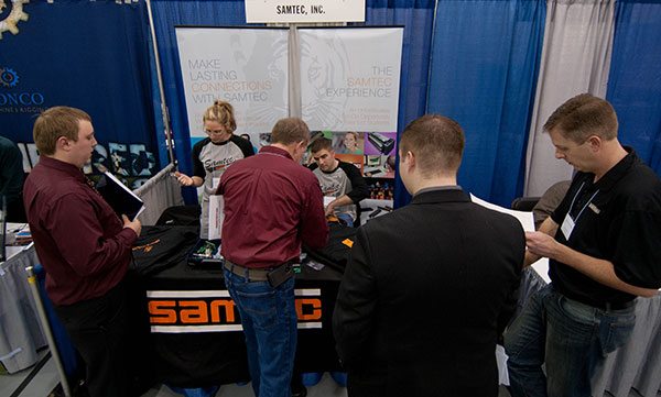 Representatives of Samtec Inc., an Erie-based manufacturer of cables and other electronic connectors, meet with plastics and machining students for internships and co-ops.