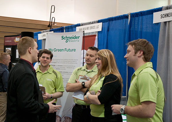 A Career Fair attendee gains the collective ear of the full team from Schneider Electric.