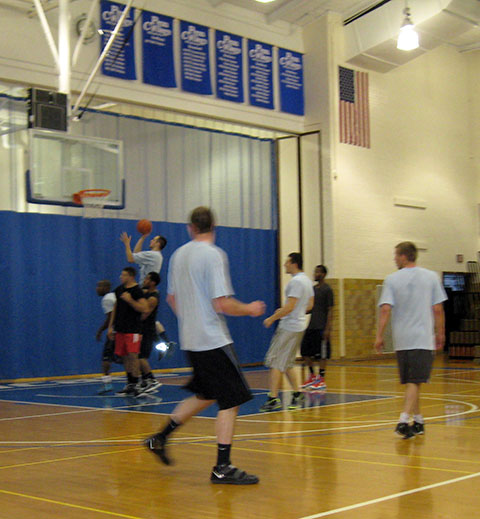 Intramural basketball teams from Penn College and Lock Haven University met Thursday night in Bardo Gym. Penn College started out with a nice run, thanks to a few three-pointers by Wyatt Decker and Ethan Kline. Lock Haven stormed back, turning the first half into a seesaw matchup until Penn College's Bryant House hit a three to send his team into the locker room with a six-point lead. Halftime killed that momentum, however, and Lock Haven started the second half with an 8-0 run. Penn College regrouped and, once again, the game went back and forth with neither team leading by more than two. "With four minutes left, Lock Haven hit its shots and Penn College suffered from the old saying, 'You live by the three and die by the three,'" said intramural assistant Jeremy R. Bottorf, who supplied the summary and photos. Lock Haven, which upped its lead to 10 with less than a minute left, went on to win, 48-37. Comprising the Penn College team were Decker, Kline, House, Allen Regan, Matthew Strayer, Colton Acorn, Stephen Armstrong, Jacob Singleton, Azeez Sulaimon and Matthew Myers. Kline led Penn College with 14 points, while Sulaimon chipped in with eight and Decker added seven. Regan and House each had three points, and Myers two.