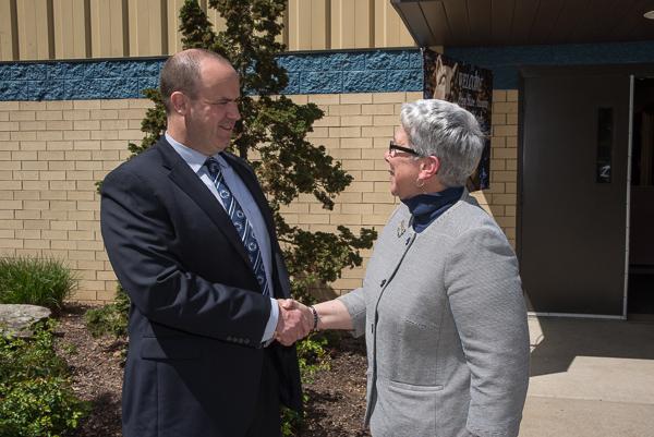 President Davie Jane Gilmour welcomes Penn State football coach Bill O'Brien to campus.