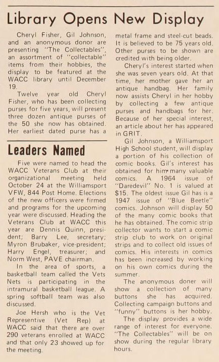 The Madigan Library offers an array of visual displays throughout the year, both in the library itself and in The Gallery at Penn College on the third floor. This is no new ritual, as the college has been doing so since the Williamsport Area Community College days dating back to the ’60s. A notable presentation, afforded coverage in the Nov. 15, 1974, issue of the Spotlight student newspaper, was titled “The Collectables": assorted collectible items from local donors. It covered a wide range of interests, showcasing antique purses, buttons and (long before