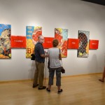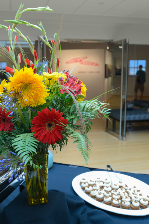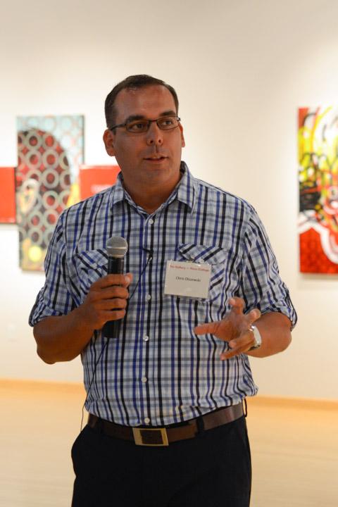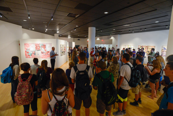 A Tuesday reception and artist's remarks opened “No Place for the Weak,” an exhibit by Christopher Olszewski that runs through Oct. 6 in The Gallery at Penn College. A crowd of faculty – as well as several entire classes of students – were on hand to hear Olszewski, whose work colorfully and intriguingly explores the way ancient Native American heritage is entwined in contemporary culture. A member of the Chippewa nation who teaches at Savannah College of Art and Design, the artist discussed retracing the Trail of Tears in a beat-up Jeep Cherokee. Hours for the exhibit are 1-4 p.m. Sundays, 2-7 p.m. Tuesdays and Thursdays, and 11 a.m.-5 p.m. Wednesdays and Fridays. The gallery, on the third floor of Madigan Library, is closed Mondays and Saturdays.