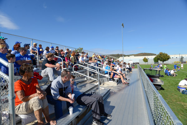 A vocal crowd fills the bleachers for a soccer doubleheader.
