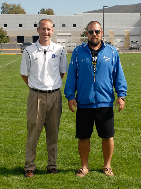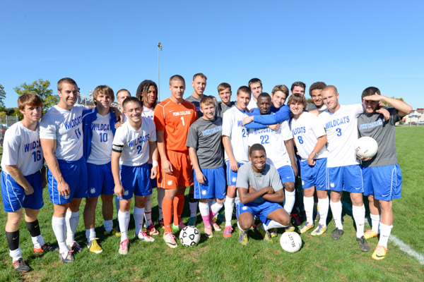 ... and joins inductee Adam N. Waigand (right) a 2005 graduate and former Wildcat soccer defender, along the sidelines the following afternoon.