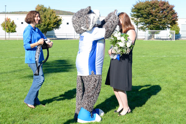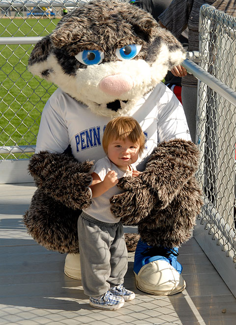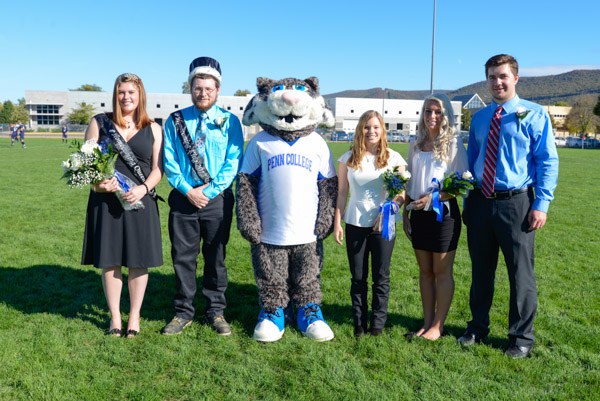 The 2013 Homecoming Court gathers at midfield. From left are Katie N. Reitbauer and Benjamin L. Thayer, king and queen; the Wildcat; Alexandra R. Donatelli, a building science and sustainable design: architectural technology concentration major from Perkiomenville; runner-up Alanna P. Ottenberg, of Williamsport, a construction management student; and Everett J. Zaluski, of Warrington, also majoring in construction management.