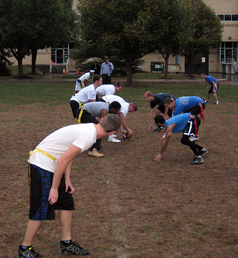 A sideline umbrella telegraphs the drizzle at Thursday's Homecoming flag-football game between first-year students and upperclassmen.