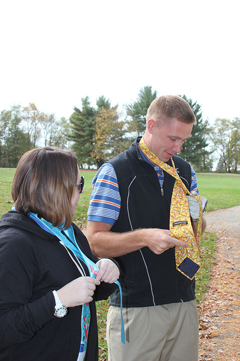Valerie L. Fessler, director of alumni relations/annual giving, coaches Casey A. Poeth through some necktie "issues."