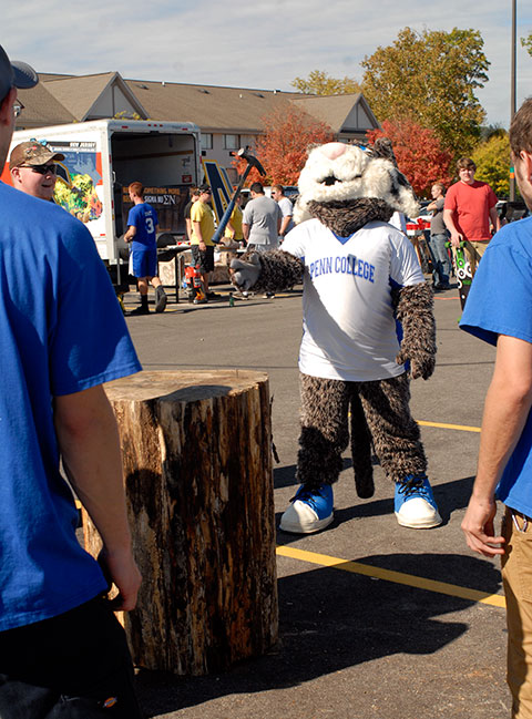 Members of the Penn College Construction Association play an entertaining game of "Stump," flipping a hammer between their legs ...