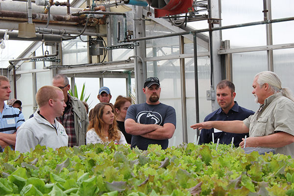 Dennis P. Skinner, assistant professor of horticulture, leads alumni and their guests on a tour of the ESC hydroculture garden.
