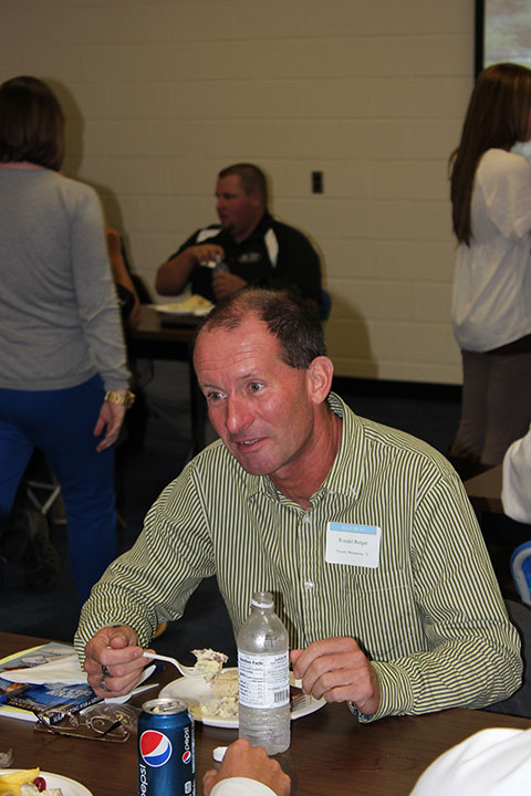 Master Teacher Richard J. Weilminster returns to the ESC for a horticulture panel discussion and lunch, toting a camera and a copy of the college's latest Centennial book.