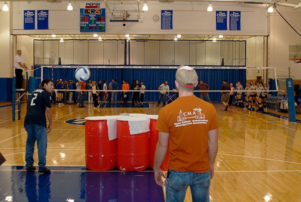 Members of the Construction Management Association, sponsors of Thursday's "Jam the Gym" night in Bardo Gymnasium, supervise the Volleyball Pong game between sets.
