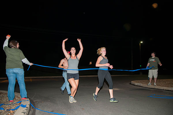Runners cross the finish line, held by Allison A. Bressler, assistant director for student activities for programming and Greek life, and student Derek E. Teay.