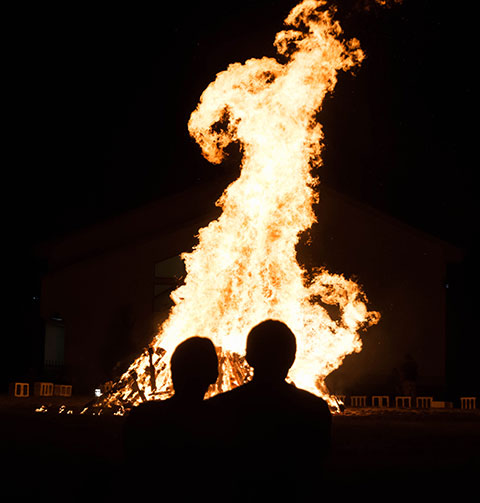 Flames lick the evening sky, silhouetting bonfire spectators.