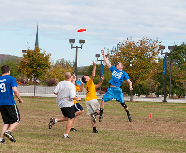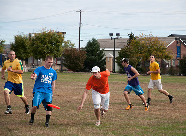 Alumni and current students met on the Madigan Library lawn for a popular Ultimate Frisbee match Saturday morning.