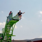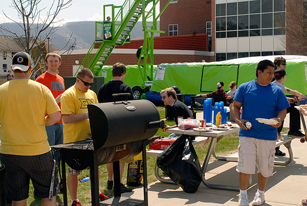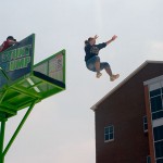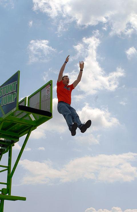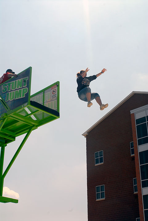 Adventurous members of the Penn College community, including faculty and students on break from an open-lab period, launched themselves from 20 feet above Rose Street Commons onto an oversized air bag Saturday. The Sky Fall attraction drew a steady line of amateur stuntmen and women, who gained access to the upper platform via a wristband earned after conquering the 11-foot threshold. The Student Activities Office organized the activity, the Interfraternity Council provided refreshments, a disc jockey (whose selections appropriately included Van Halen's "Jump") entertained the crowd and good weather completed the festival atmosphere.