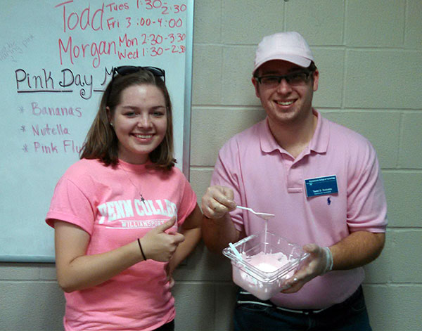 Penn College's annual observance of Breast Cancer Awareness Month got a nourishing nudge from Commuter Assistants Morgan N. Keyser and Todd D. Robatin on Tuesday. The pair themed their weekly "Peanut Butter and Jelly Time" in honor of the campus "Pink Out," offering tinted Marshmallow Fluff to all who stopped by the Bush Campus Center Commuter Lounge in appropriately colored dress.Photo provided