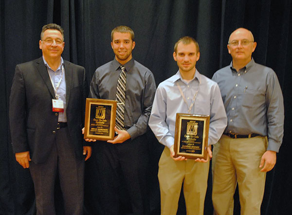 Three Penn College students and a faculty member, including a Society of Plastics Engineers national scholarship recipient, attended the recent 30th annual SPE Blow Molding Division Conference in Chicago. Thomas J. Ryder, of Muncy; Julia I. Gilchrist, of Hanover; and Bryan T. Robinson, of Gilbertsville – all plastics and polymer engineering technology majors – helped staff a tabletop display and represented the college throughout the exhibits area, conference sessions, and among students attending from other colleges and universities. During the event, Robinson received the second half of his two-year $6,000 Carrie Fox Solin Memorial Scholarship from the organization. The group was accompanied by John R. Bartolomucci, assistant professor of plastics and polymer engineering technology, who was one of five panelists in a "Training Resources for Blow Molders" discussion. Moderated by Geoff Ward, of Argi Industrial Plastics, the panel also included Penn State Erie, the Behrend College; Ferris State; Calhoun Community College and Paulson Training Programs.Photos provided