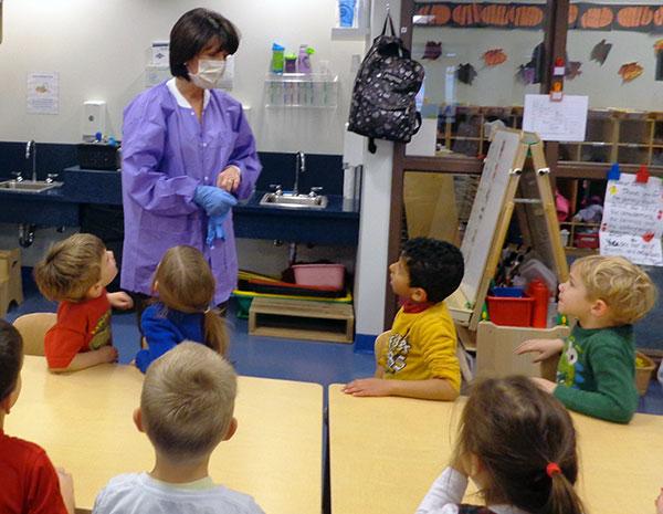 Myreta Churba, a part-time faculty member and 1984 alumna, recently presented dental hygiene lessons at Penn College's Dunham Children’s Learning Center. Churba is a community outreach dental hygienist with Susquehanna Community Health and Dental Center. In addition to Thursday's class activities, some children received dental cleanings and screenings on-site if their parents had enrolled them in the program.Photo by Regina G. Andes, assistant group leader, Children's Learning Center
