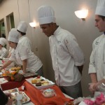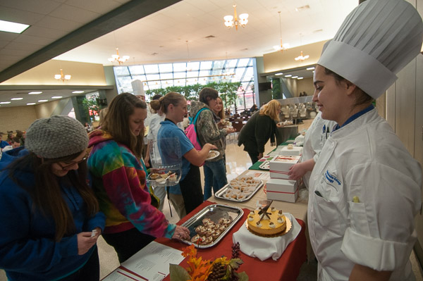 The Advanced Patisserie Operations course completed its Trade Show activity Wednesday. As part of the course, the students develop a product line or business concept and put their marketing lessons to work by creating and staffing a display that includes product packaging, menus or price lists, business cards and other marketing materials, as well as samples. Their innovations included gluten-free cookies, pretzel-bread croissants, and bialy rolls topped with onions and poppy seeds.