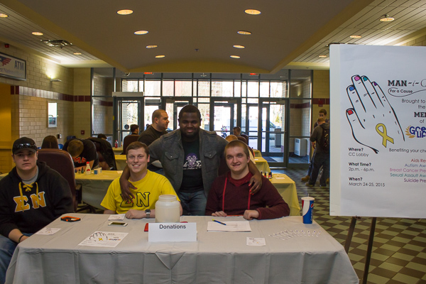 Penn College's second annual "Man-i-Cures" fundraiser, in which fraternity brothers paint fingernails for a cause, resulted in $642 in contributions to be shared by six charities. For a $5 donation during the two-day event, each "salon" patron could pick his or her color based on the chosen charity: purple for suicide prevention, for which $172 was raised; pink for breast cancer prevention, $127; teal for sexual assault awareness, $117; blue for Autism Speaks, $82; gold for the THON fight against pediatric cancer, $82; red for AIDS Resource, $62. Eyewitness News reporter Valerie Tysanner visited the Bush Campus Center for a piece that premiered Tuesday evening and was aired several more times throughout the news cycle.Photos by Dalaney T. Vartenisian, student photographer, and Morgan N. Keyser, a graphic design major from Cogan Station