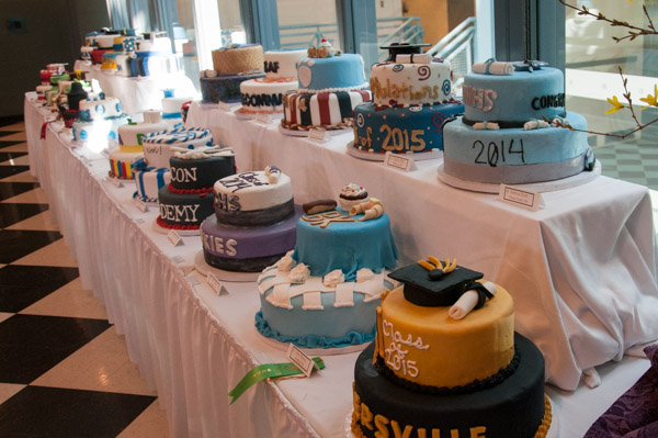 Students in the Cakes and Decorations course skillfully fill a table with graduation-themed cakes.