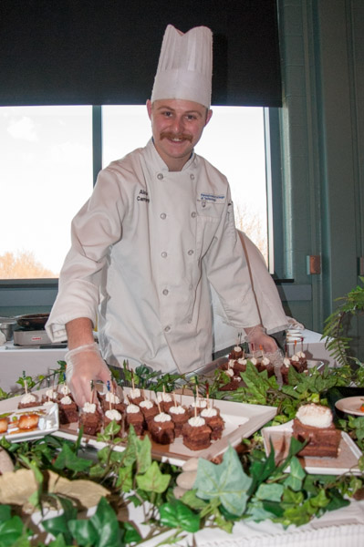 Alexander R. Campolongo, of State College, adds samples of chocolate sponge cake to the table of “The Bean Grinders,” staffed by Campolongo and Kyle H. Abel, of Nazareth.