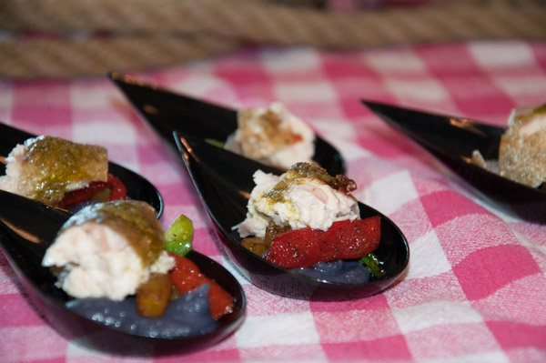 A bite-sized sample of fried trout stuffed with smoked-trout mousse.