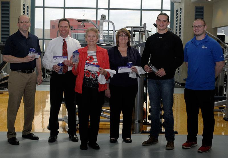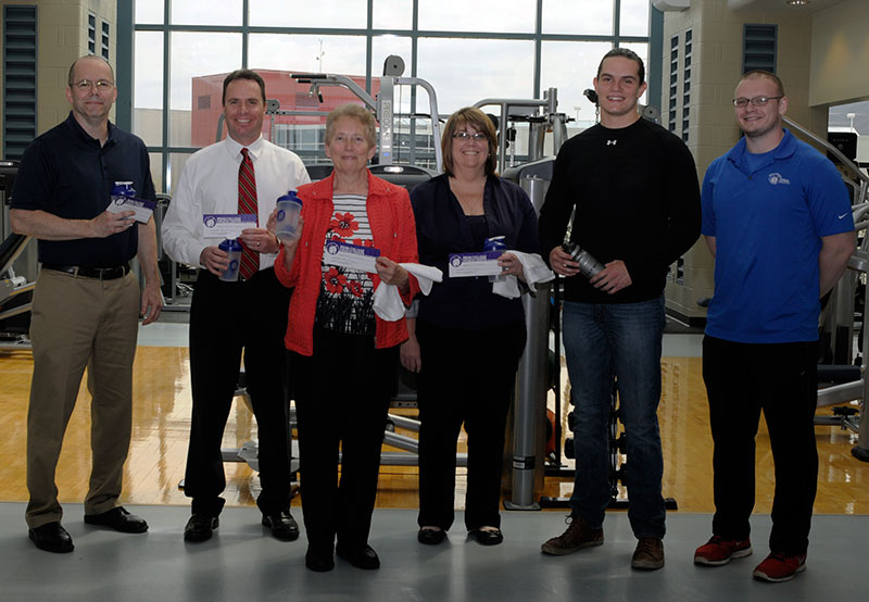 Penn College students, staff and faculty participated in a Fitness Center promotional event to help encourage members to see through fitness-oriented goals set as New Year’s resolutions. The Resolutions Fitness Challenge began the second week of classes and ended April 10, hosting 28 completing participants actively involved for the nearly semester-long duration. Participants checked in and recorded workout programs on a daily basis to accumulate points to meet time-based goals. Several tiers of prizes were awarded upon completion of goal checkpoints in addition to grand-prize packages awarded to six finalists. Prizes were Penn College nutrition shaker bottles, water bottles, T-shirts, workout towels, thumb drives and free one-semester memberships for staff/faculty. Top student awards were given to Jillian Helmus, of Middletown, an on-site power generation major who reached 60 points, and Cody L. Hagen, of Lancaster, an automotive technology management: automotive technology concentration major who amassed 63 points. Staff/faculty grand prizes were awarded to Beverly A. Hunsberger, college transition specialist at Outreach for K-12; Michael R. Triassi, director of sales and restaurant operations for the School of Business & Hospitality; Tobey M. Robison, senior financial system analyst; and Daniel F. Warner, web programmer/analyst. The program was well-received by members and is projected to be offered again in the Spring 2016 semester.