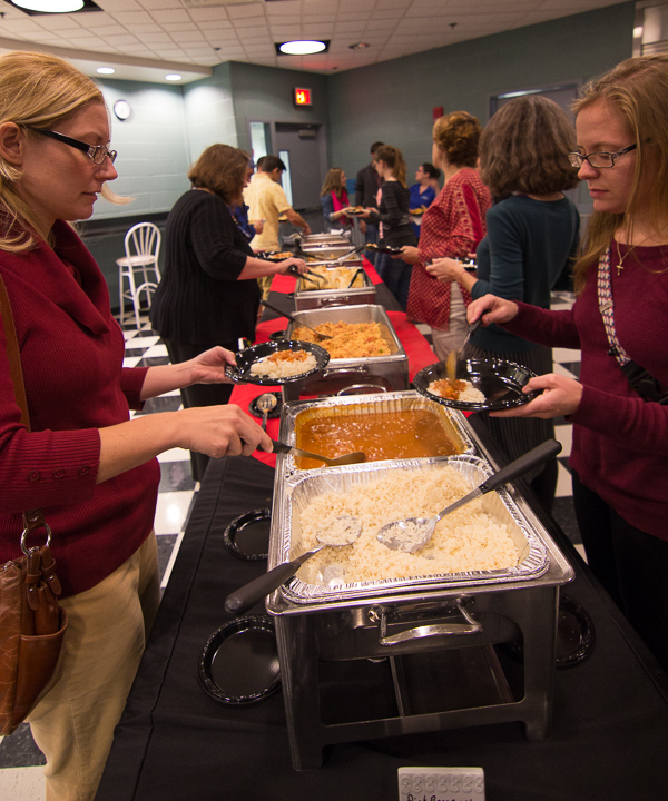 Penn College's inaugural Hispanic Heritage Month Dinner, with a menu that incorporated winning recipes from a student and an employee, was held from 6:30-9 p.m. Tuesday in Penn's Inn. Ryan A. Gibson, an aviation maintenance technology major from Lansdale, shared a recipe for pink beans with white rice; Sylvia Lukpetris, a part-time member of the accounting faculty, submitted the salsa and Spanish rice recipes. Sara H. Ousby, director of diversity and community engagement, worked with Dining Services to supplement the menu with other dishes, including black bean empanadas, Beef Picadillo and pork tamales. The event, held on the second floor of the Bush Campus Center, included musical entertainment and giveaways.Photos by Dalaney T. Vartenisian, student photographer