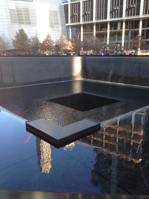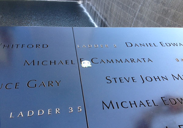 A Penn College employee and longtime Little League Baseball World Series team "uncle" made an emotional trip to New York City on Saturday, carrying a commemorative pin in tribute to a former Little Leaguer who was the youngest firefighter to die on Sept. 11, 2001. "As team hosts, we order pins to give to the players that participate in the Series," said Marlin R. Cromley, a cashier/customer service associate in The College Store, who kept one of this year's pins in reserve. "The one pin I saved was for this very moment, that of placing it on the name of Michael F. Cammarata. On behalf of the Little League World Series team uncles, I wanted to let Mr. Cammarata's family know that their son and brother will always be in our thoughts. I placed my hand on his name 32 times – one time for each team host." Coincidentally, Cammarata's position number was 9 (right field) and his uniform number was 11 – 9/11. Little League retired that number, which he wore as a member of the South Shore Little League from Staten Island, New York, that finished third at the 1991 Series. It now adorns the right-field wall at Howard J. Lamade Stadium in South Williamsport, never to be worn again by any Series player. Cromley and his wife, Brenda, were among those on board a Student Activities-organized bus trip to the city.Photos provided