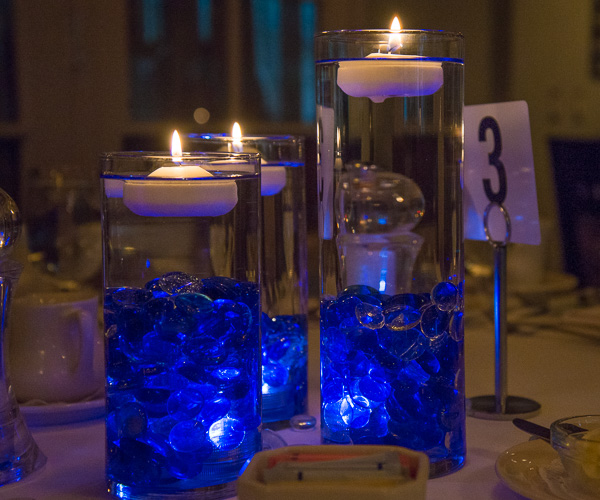 Glowing centerpieces in Wildcat blue, a special touch by April M. Yancey, secretary/receptionist for athletics, adorn the Hall of Fame banquet tables.