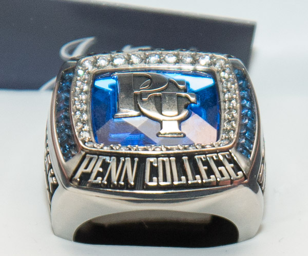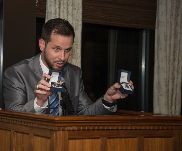 Showing off the new Hall of Fame rings is Matt Blymier, assistant director of athletics/sports information director, who coordinated and emceed the banquet.