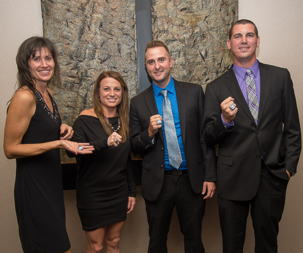 The 2016 inductees to the Athletic Hall of Fame – (from left) Bambi Hawkins, Tamara Pavlov, Craig Flint and Greg Solyak – strike a winning pose with their new Wildcat bling. (Honorees had their choice of a ring or necklace pendant.)