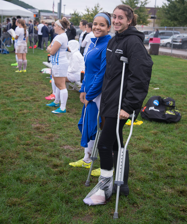 With an injured ankle wrapped in plastic, Francesca M. Timpone and soccer teammate Tania Parra smile through a damp and muddy day.