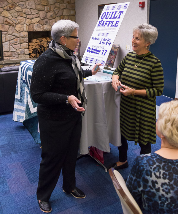 The president talks with Pam Schuman, whose late husband, Chester D., was the college's longtime admissions director and golf coach. A quilt is being raffled to raise money for a memorial scholarship fund.
